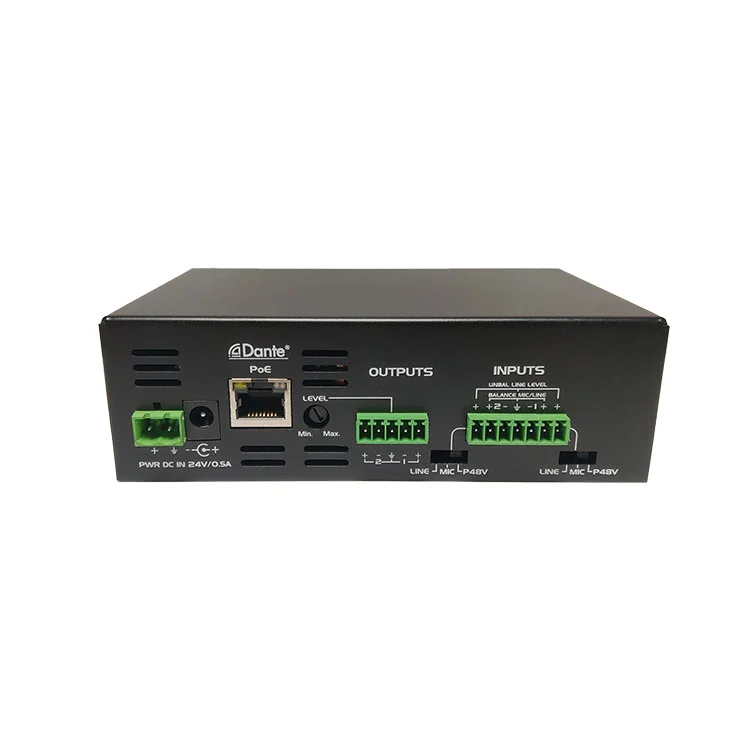 DB0202 on korkealaatuinen Dante-rajapinta, joka sisältää kaksi MIC/Line-tuloa, jotka on suunniteltu muuttamaan saumattomasti kaksi Dante-kanavaa analogisiksi äänilähtöiksi ja kaksi analogista äänituloa Dante-verkkoon.
