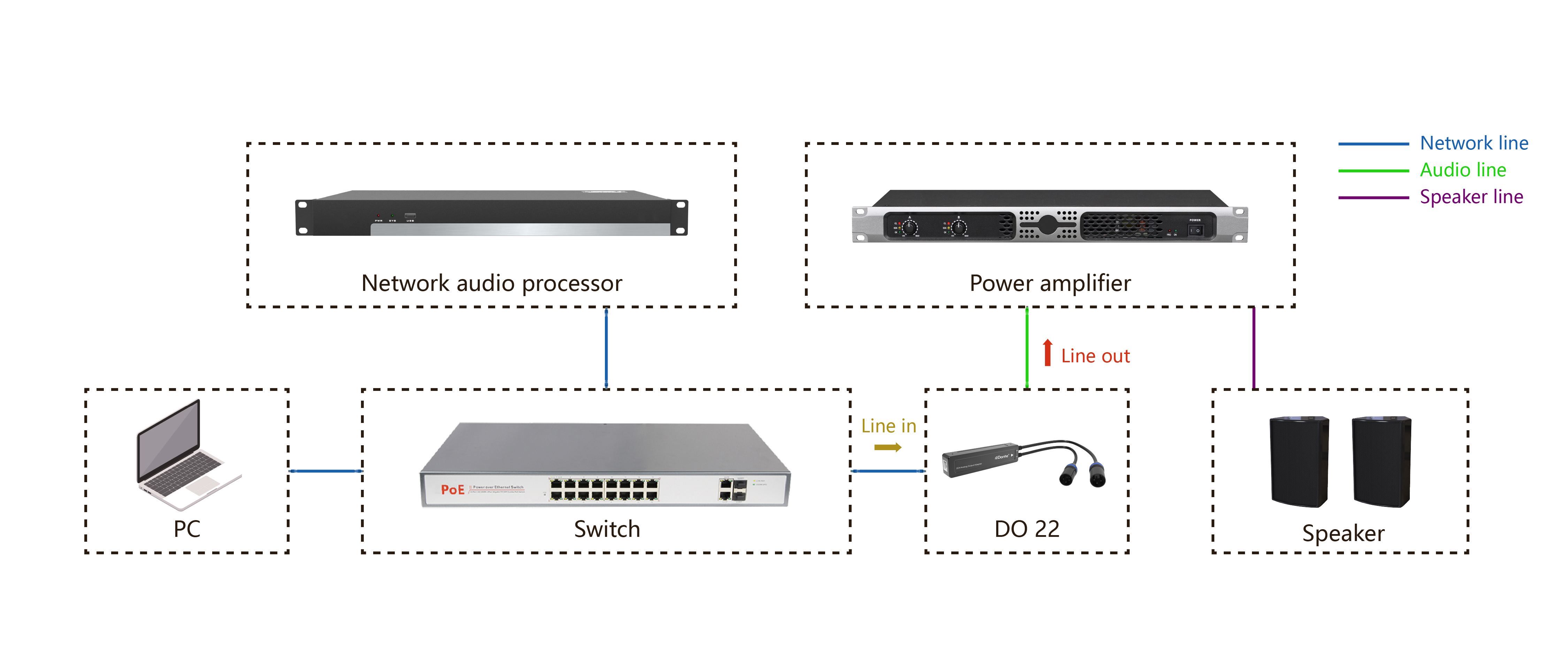 4. Muunna Dante Network Audio -signaalit analogisiksi äänisignaaleiksi lähtöä varten.
